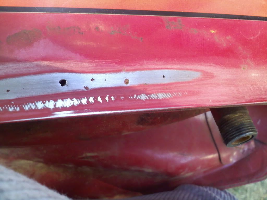 Next we checked the gas tank. There was for sure some rusty chunks rattling around in the tank. So, we took some fine sand and put it in the tank and shook it around (several times) to break the rest of the crap loose. Considering there is a wall around the filler hole, I was surprised at how easy it was to get all the sand out. A vacuum with a small hose attachment and a small flashlight easily took care of the rest of the sand. That was about when I found the holes in the tank though.