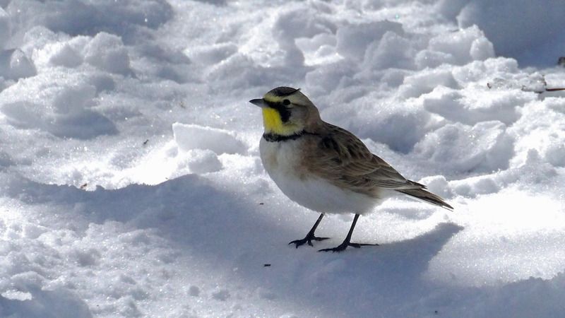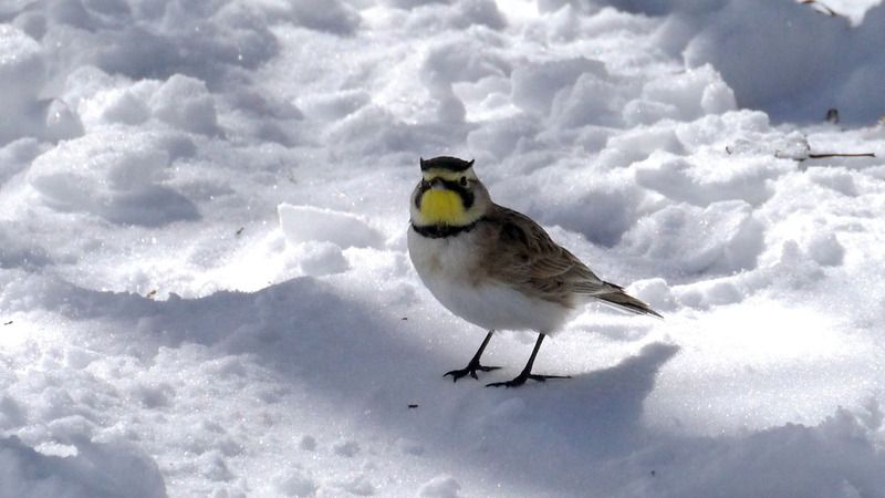 Yesterday, I took a drive along the Peak-to-Peak and found a few Horned Larks feeding along the roadside and bravely gathering sand and salt in the wheel tracks on the highway. While this is common behavior on the plains I haven't seen it much in the mountains. I'm guessing that these are birds that are now establishing breeding territories in the alpine tundra but have been forced to forage at lower elevations due to large amount of snow along the Continental Divide. (We've had 12" in the past two days.)