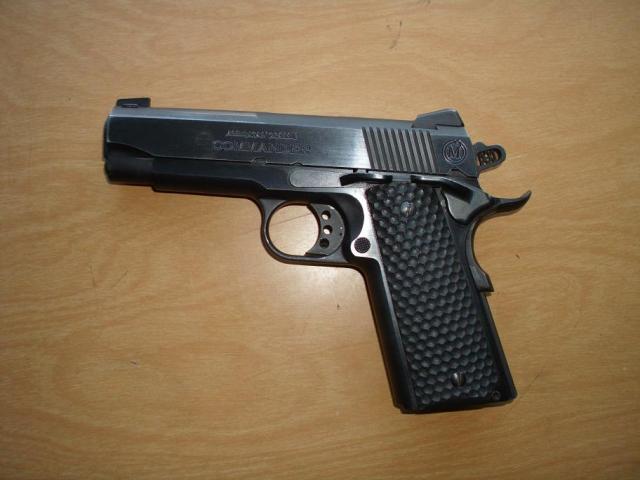 Here's my secondary or even third tier 1911. LOL Metroarms AC Commander. I have run about 2500 relatively trouble free handloads thru it. 230gr lead bullets. I had to adjust the slide catch and adjust the tension on the extractor when new. Bullets feeding up thru the mag would bump the slide catch and cause it to randomly hold the slide open. I adjusted the extractor tension and ejector to stop the cases from being thrown in my face. For $275 + tax it's a good shooter. Super accurate. Bluing virtually nonexistent. Recommend it to anyone that wants a great shooter for a super low cost and isn't worried about tweaking a couple things on the pistol. I bought some cheap grips from http://ultimate-equipmentstore.com/b...for101911.html when they were 20$. Grip screws keep walking out so they will get locktited in. See a trend?