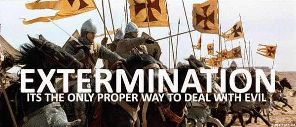 Umm, if you're going to advocate fighting evil, perhaps you shouldn't use imagery associated with the Knights Templar and the Crusades...
