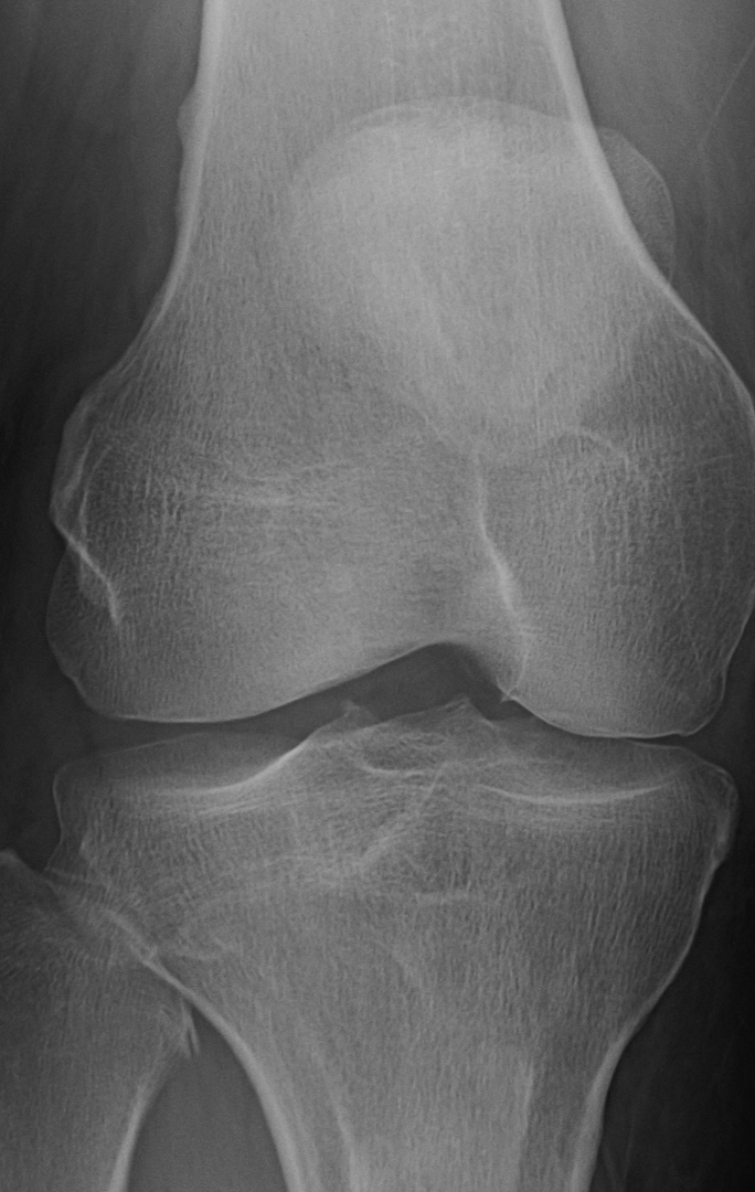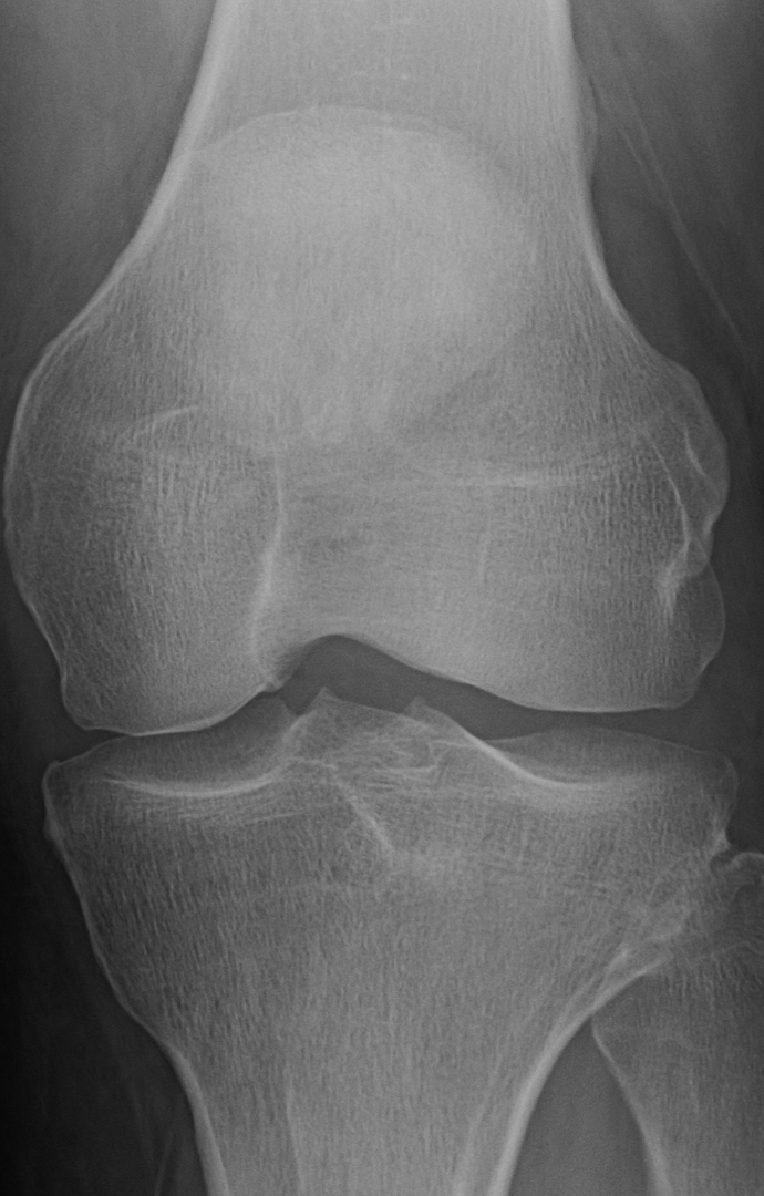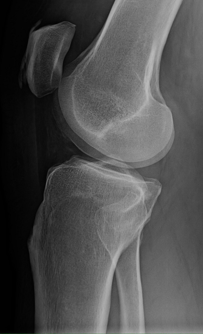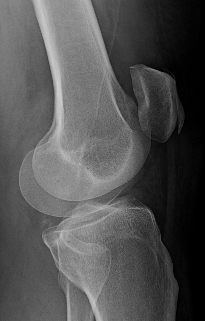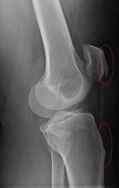On the lateral view I can see see a section of calcification on the anterior aspect. ................... The worrying part is just bellow the calcium I see a region that looks like a chip fracture or an older one. Its the diagonal line with the offset. Of course, I could just be nitpicking and just seeing something that is an optical illusion.