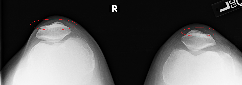 Your sunrise pateler views (bottom knee cap floating in space view) are worrying. You are developing bone avulsions (the part where it looks like it is separating) most likely due to impact injury coupled with straining tendons. You got to start wearing knee pads for what ever you are doing that is impacting them. If that continues in the same path, even walking will be a chore.