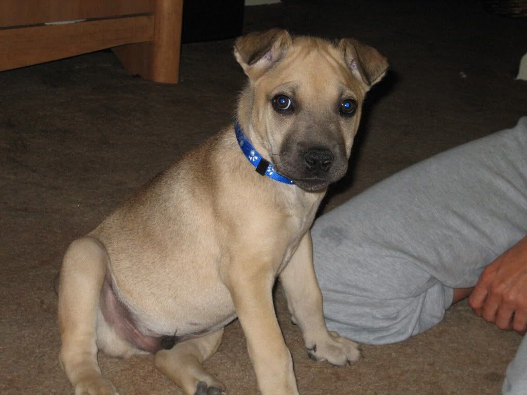 He is a Bull Mastiff/Shar-Pei mix and is an awesome dog. He is now 3+ and tips the scales at 100#. I am glad my wife manages a pet store!