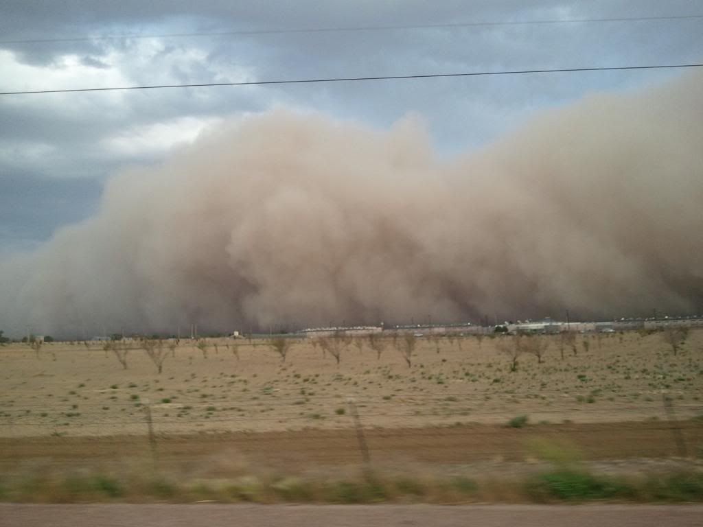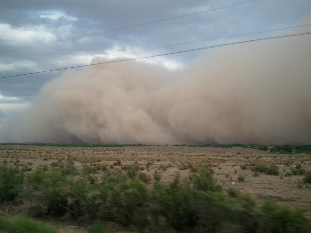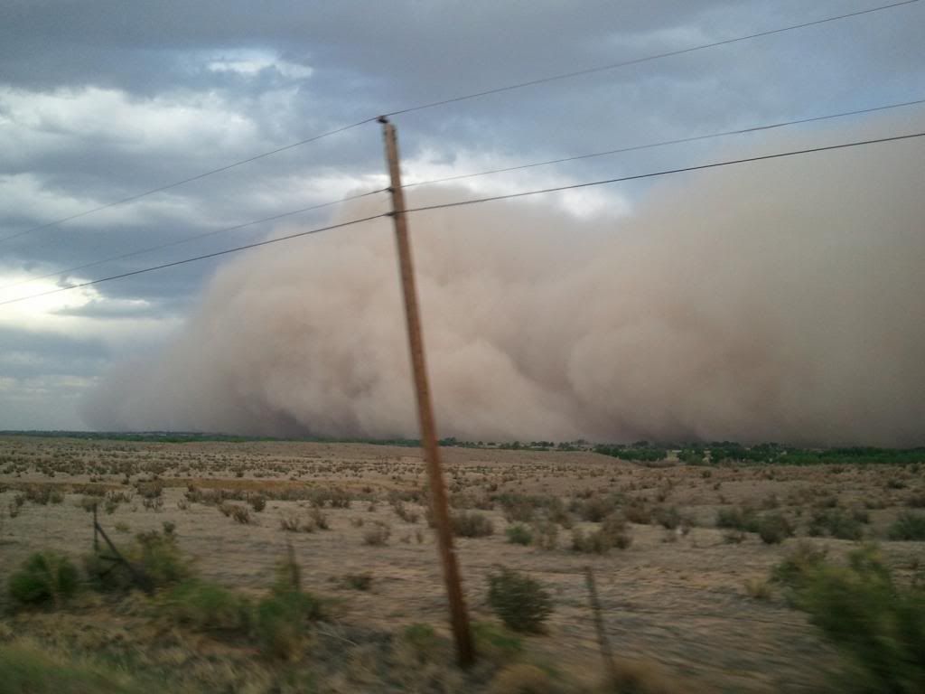 Some pics of our dust storm rolling in yesterday. We were headed east out of Pueblo when we noticed her alongside and behind us. We raced it at 80mph for about 15 miles. Got to the house the same time it did. It was dark for about 45 minutes but we could see far enough to see our tree branches getting broken off. You can see the storm engulfing Crowley County Jail in one pic.