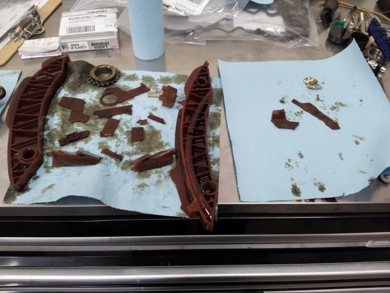 Car was running when it came in. I had to do a valve cover gasket and the customer asked I look into why his timing chain was making more noise then usual. It had been rattling for about 5 months now he said. I noticed that there was something not quite right with his timing chain guide and pulled out a couple of plastic pieces. Then called him and told him the engine timing components needed to all come out. This is what is left of his timing chain guides. The pieces on the right are what I found INSIDE his oil pump chain housing.