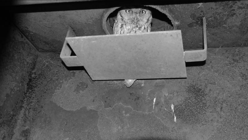 The house has a standard 8" chimney pipe with a chimney cap but apparently the screening had fallen out of place. Small owls nest in natural tree cavities. When the little owl went into the chimney cap to investigate, it dropped about 15 feet. Inside the stove was one unruffled Western Screech-owl perched on a spark shelf below the chimney. There was no apparent injury so I set the bird on the ground to make sure it could fly. After getting it's bearings the owl flew directly to a dead cottonwood snag in the neighbor's yard and disappeared into a hidden cavity. I walked to the tree and the bird popped it's head out a couple of times, seemingly comfortable to be back home.