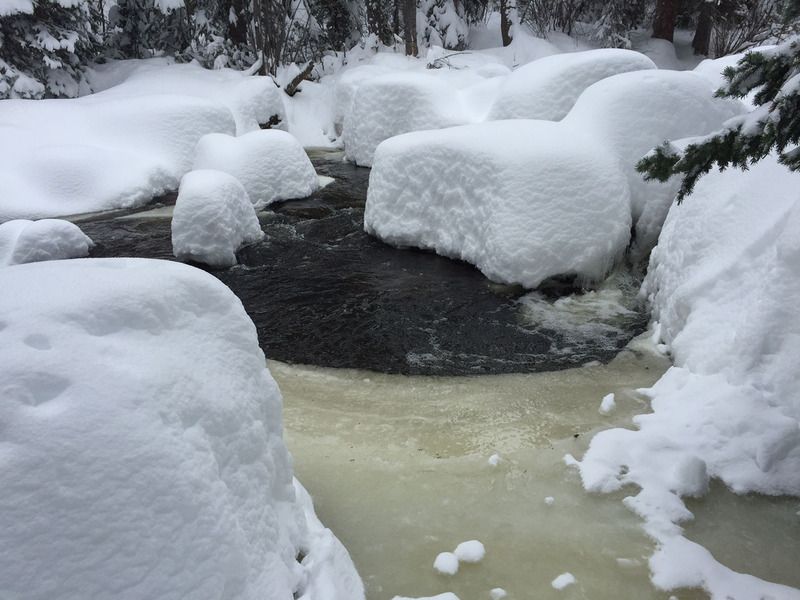 My cousin sent a couple photos taken yesterday at my cabin off the Peak-to-Peak north of Ward. The river was opening up when it dumped a good 3 ft. of snow. The snow causes the river to rise which accelerates the melt of the river ice.