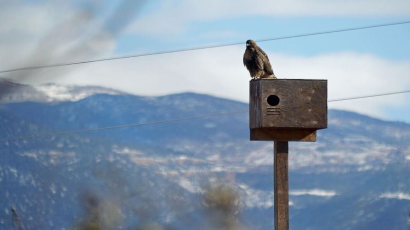 Photographed at a hundred yards from my home office window. Not a great pic but interesting that a local resident Red-tailed Hawk sometimes hangs out on a Barn Owl box in the yard. The box is 16 ft. off the ground. Falcons have nested in the box the past few years but they don't appear to be roosting in it at night now. When we butchered elk a few weeks ago we put the scraps out by the owl box and the Red-tail took advantage of it. Normally the Red-tails perch on power poles another hundred yards out watching for prairie dogs but the abundant rabbits may have brought the hawk in closer. The Grand Mesa is in the background.