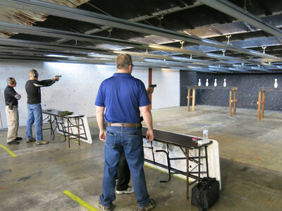 Shooters take aim on Monday Night Bowling Pin Shoot at the firing range of the Bristlecone Shooting, Training and Retail Center in Lakewood, Colo.