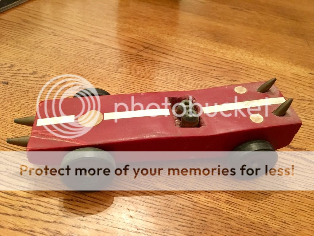 When I was in the Cub Scouts we did this every year. The first two years I did not place but the next three I won first place. My cars looked like very much like this in shape, I made sure the axles were aligned and the wheels all touched the surface the same. I would build the cars, my dad would chisel out a hole in the bottom and we would go to the post office to weigh it on the beam scales they used back then. He would add fishing weights to get it up to within a fraction of the max weight to make sure we would pass weigh in at the race. In my own flash of brilliance, I asked that dad put the weight at the rear of the car. This gave it a little extra shove at the end of the ramp and a little higher speed at the end of the track. We went to the all city championships two years in a row and got a second and a third.