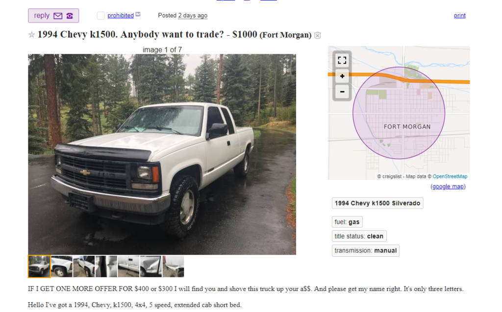 I have to say, I cringe anytime I have list something for sale outside of this forum. It never seizes to amaze me what rock these people crawl out from. Between Craigslist and Facebook Market place, I honestly don't know which is worse. I was hoping one of you fine gentlemen would buy my truck that is listed in the TP but alas, I had listed it elsewhere. My dad sent me this last night and if you have ever sold anything on Craigslist, you know his pain.