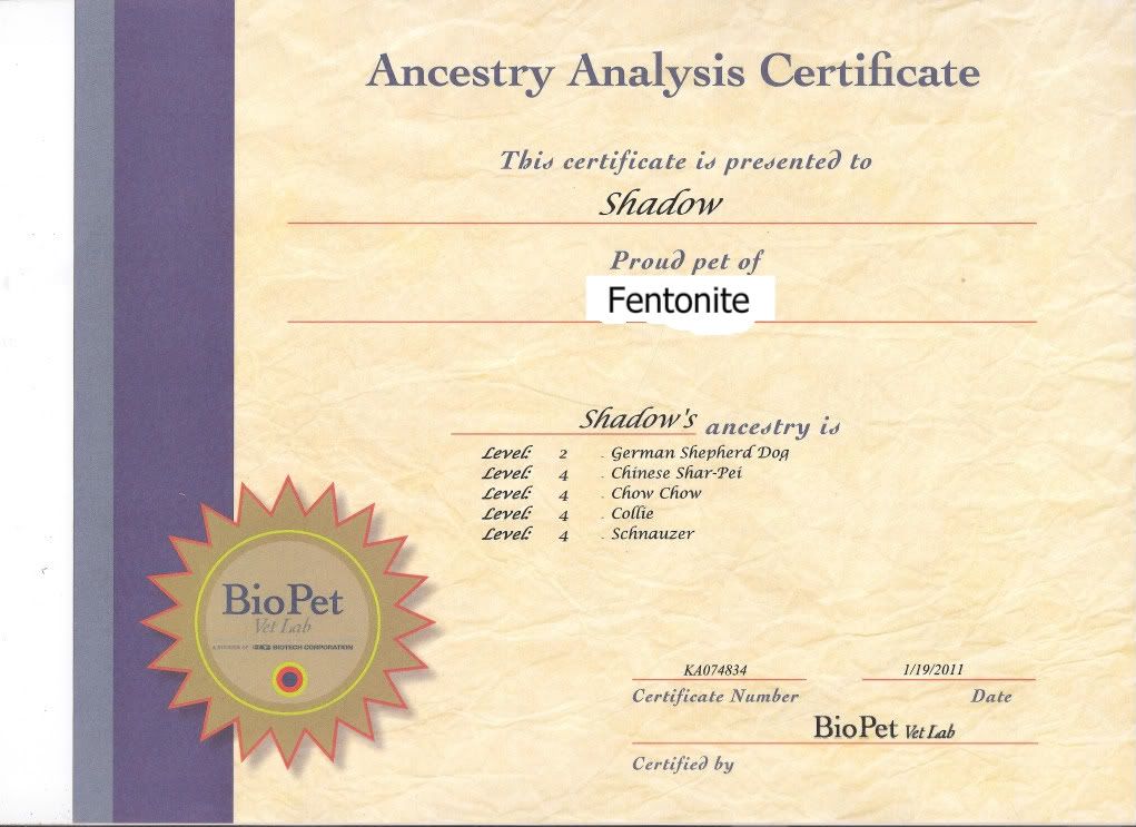 OK - Here's the certificate with the DNA results. Only 3 folks wanted to make a guess, and all three had Chow in their answer, but Steveopia got the closest. Shadow has mostly German Shepherd, then Shar-Pei, Chow, Collie, and Schnauzer. Steveopia initially said Chow/Shepherd (great guess), then chose Chow/Border Collie, so I've got to give it to him.