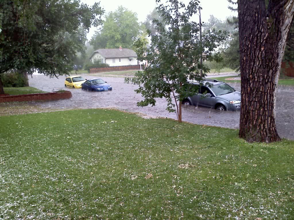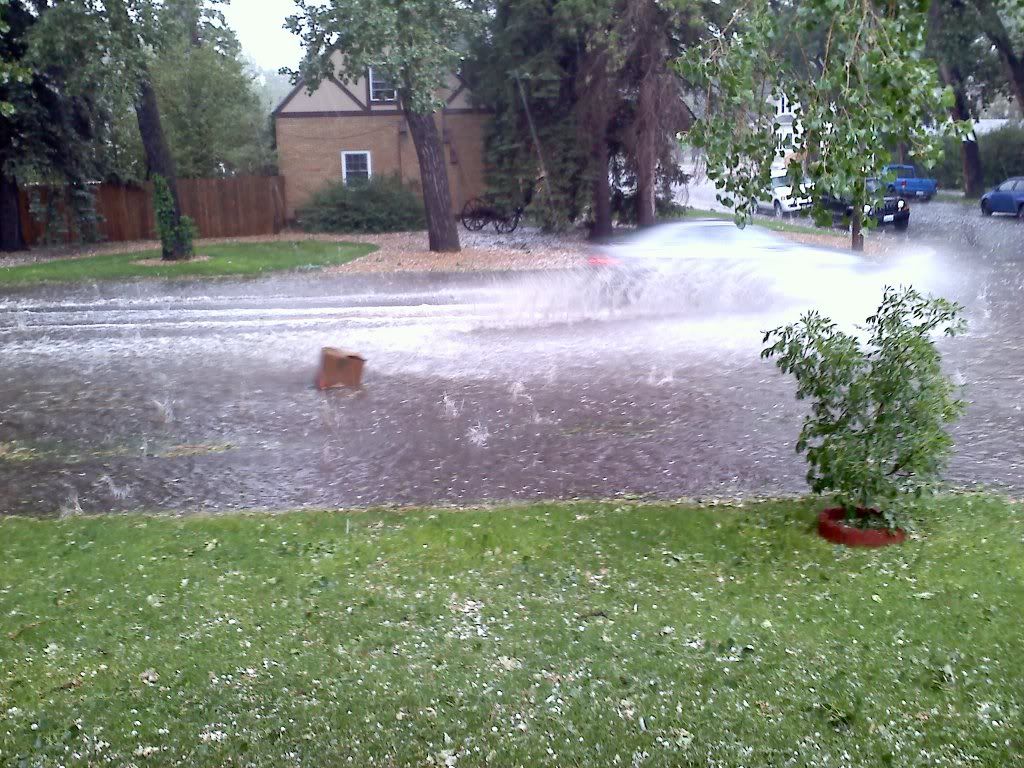 First we went to my moms house in Cheyenne for pizza and hail damage on our car, these arent our cars just a good pic of how high the water got, you couldnt see the curb, part of the grass, sidewalk etc. Then the second pic is stuff floating down the street from a garage sale down the street! My moms car got damaged from the storm last week and the insurance lady was just out yesterday and "totaled" the car. Now my car has damge on the roof, hood, trunk. The hail got worse after the pics.