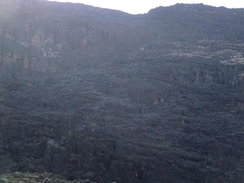 Leaving Barranco Camp on Day four, you climb the steep looking (but not hard) Barranco Wall. The little white dots are porters carrying their load up the hill.