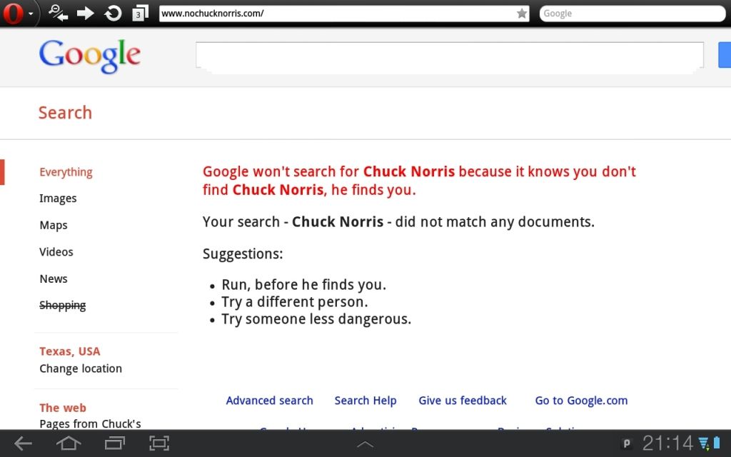 Google won't search for Chuck Norris because it knows you don't find Chuck Norris, he finds you.