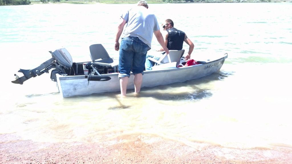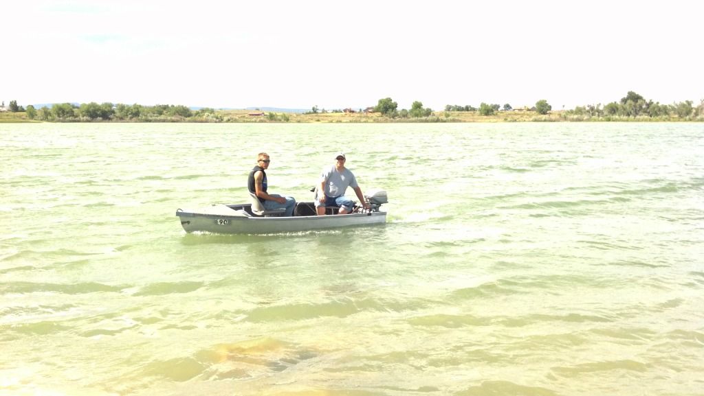So its just a 12 footer with 6hp evinrude (that needs a couple seals but ran good). I took my son and nephew out for the maiden voyage today at Wellington #4. Its pretty heavy with wood floor, forward battery compartment, seats, motor and trolling motor with 3 people it rode the waves pretty good when the wind came up. Just fun to get my own boat out. Now i need a bigger oneBut it was nice to be able to pull right up on the sand in the smaller boat and step in and out of it.