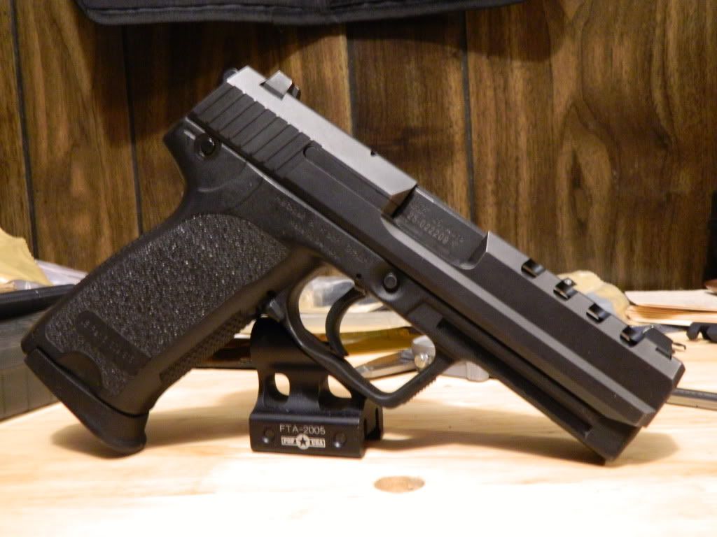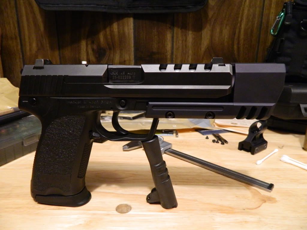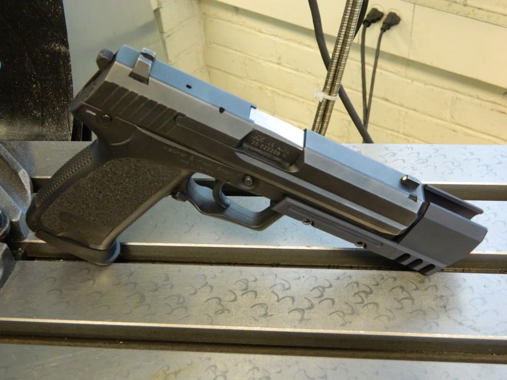 So last time I showed pictures of my stuff, it was work done on some G30's. This time, it's my Hk USP. I'm just going to have fun with this gun. I'm going to end up doing absolutely everything I can to this gun, slide lightening (maybe more), matching the spring rate to the slide weight, I fit an aluminum weight to it that a friend made me, I'm putting a Delta Point on it recessed into the slide with the sights moved forward in front of it, Cerakoting the slide and weight Burnt Bronze, coating the Jarvis barrel with TiN along with a couple mags.... I might, might even flute the barrel. This is just an "all or nothing" gun for me. Anyway, here is what it looks like right now. I know you can't see it in the pictures, but the serrations in the slide match the angles of the serrations in the weight. The size of the serrations are different and so is the spacing, but I wanted it to also look good if I didn't have the weight on. For those of you that like the Match, but also hate the extra weight, that the weight has... the aluminum is awesome!