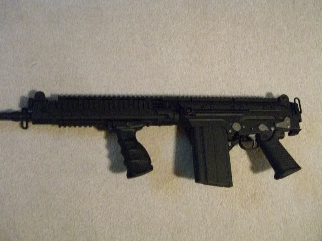 Here's some quick pictures of my new DSA FAL. It's a SA58PCONG, a Para Congo with extreme duty extended scope mount, full length rail interface handguards, SAW grips, and NP3 internals. The Duracoat covers all the accessory parts and it looks great! Sorry about the pictures - my camera died and I'm using my wife's at home.
