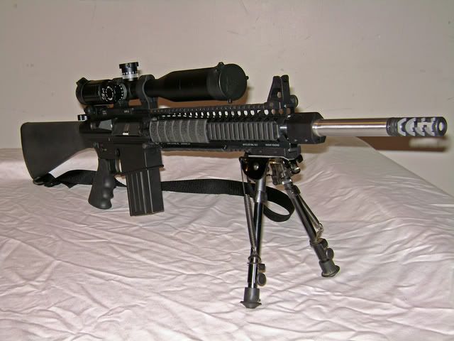 This started out as a DPMS LR-308 AP4. Pretty much all that is left of that is the upper and lower reciever. I decided I wanted something that would reach out a little farther than the carbine.